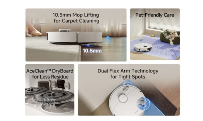 L10s Ultra Gen 3 juga dilengkapi Dual Flex Arm Technology dengan SideReach Vacuuming untuk pembersihan hingga ke tepi dinding tanpa sisa debu, serta MopExtend RoboSwing Technology yang memperluas jangkauan pel hingga 4 cm agar lantai tetap bersih di area bawah furnitur.