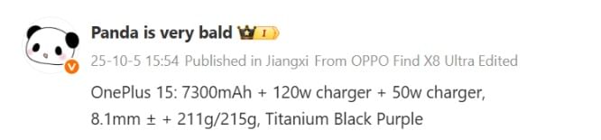Menurut informan tersebut, OnePlus 15 akan dibekali baterai berkapasitas besar 7.300mAh, baterai terbesar yang pernah ada di ponsel OnePlus. Perangkat ini akan mendukung pengisian daya kabel 120W dan nirkabel 50W.