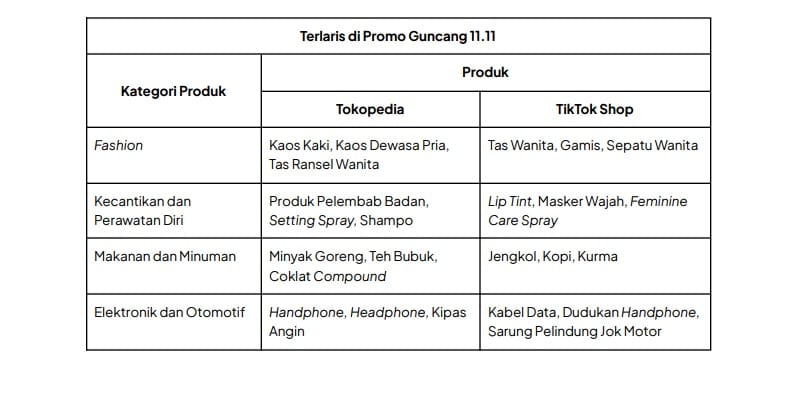 Di berbagai kategori produk utama, baik Tokopedia maupun TikTok Shop mencatat pertumbuhan pesanan yang kuat selama periode 11.11 dibandingkan hari normal. Kategori Makanan & Minuman mengalami kenaikan tertinggi sebesar 76%, disusul Otomotif & Elektronik sebesar 54%, Kecantikan & Perawatan Diri sebesar 48%, dan Fesyen sebesar 35%.